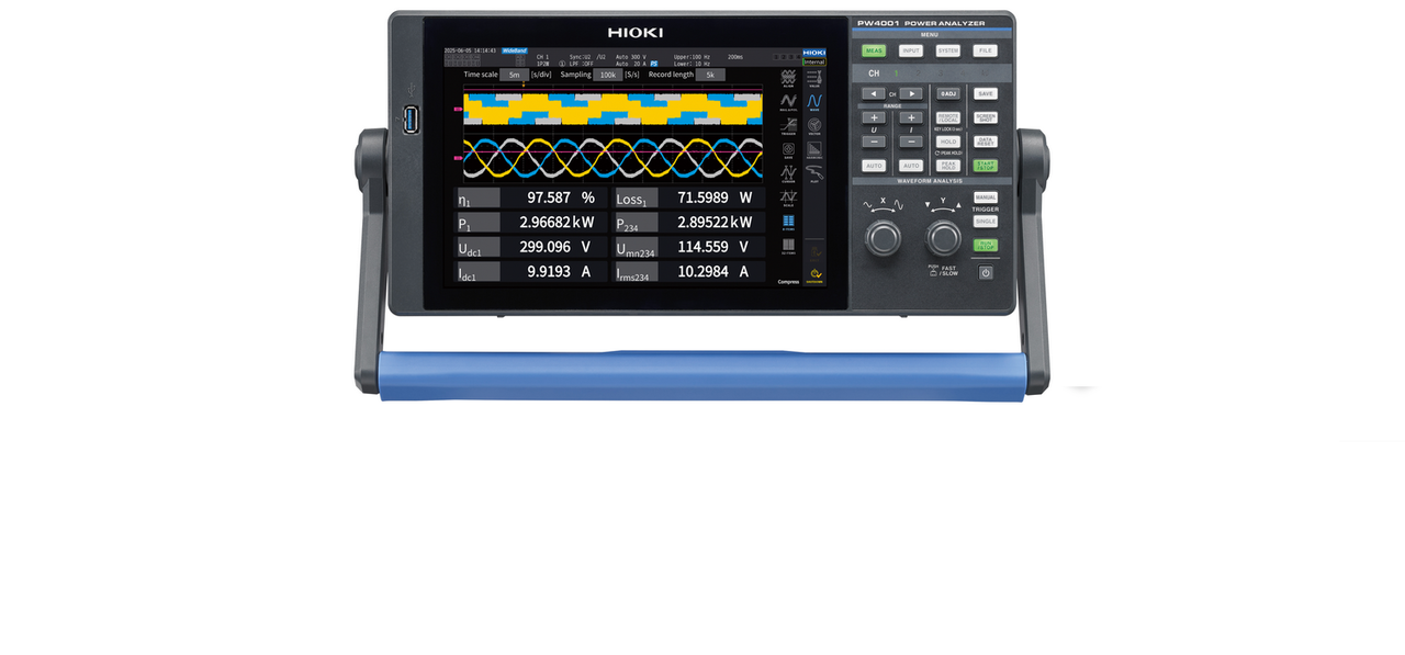 A HIOKI PW4001 egy hordozható, 4 csatornás teljesítményelemző, amely kompakt kialakítást és laboratóriumi szintű precizitást ötvöz. ±0,04% pontossággal DC és 600 kHz közötti frekvenciatartományban, valamint ±0,03% rdg. ±0,01% f.s. DC és 50/60 Hz esetén, biztosítja a WLTP (Worldwide harmonized Light vehicles Test Procedure) teszteléshez, a DC-DC átalakító hatékonyságának értékeléséhez és más igényes mérési feladatokhoz szükséges pontosságot a kutatás-fejlesztés, a gyártás és a terepi környezetben.